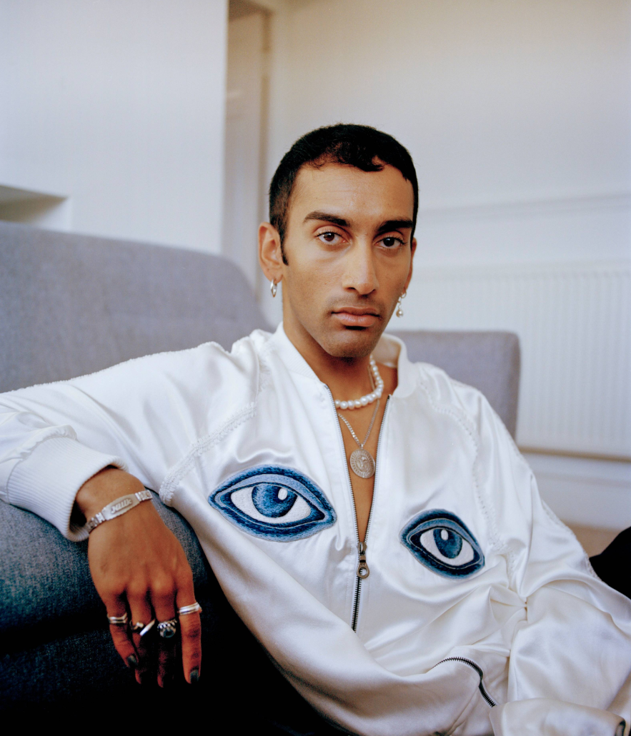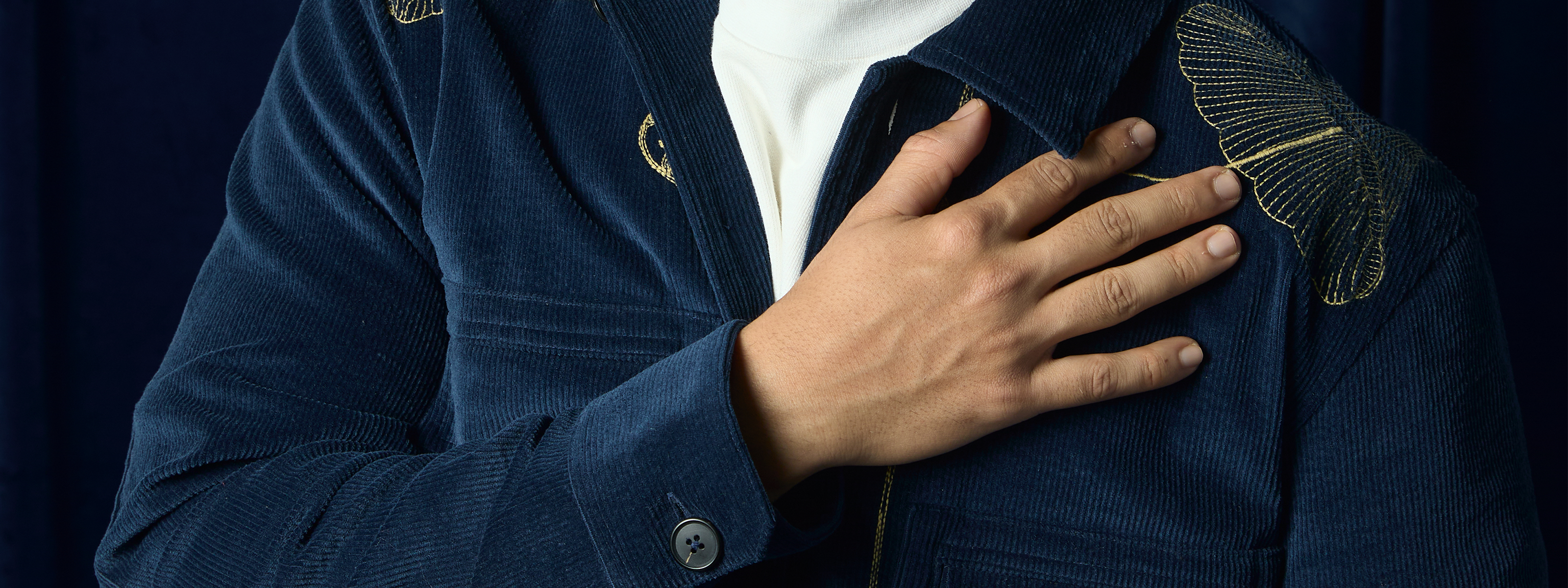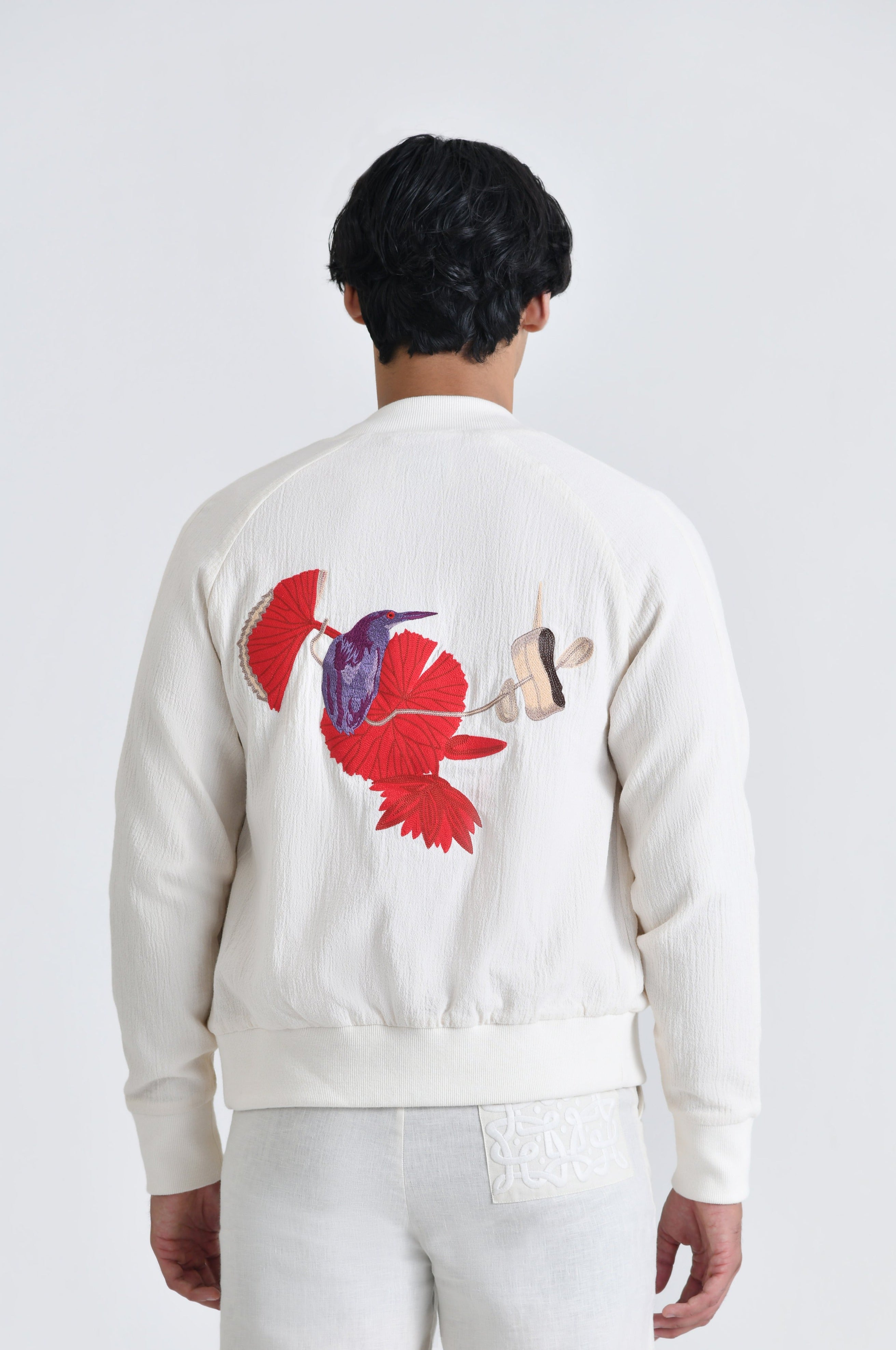The Shadow Maalai Evening Bomber, made of a sheer velvet jacquard with a Nehru Collar is a versatile day to night jacket that features the Maalai print depicting the flora and fauna of South India's rich backwaters.