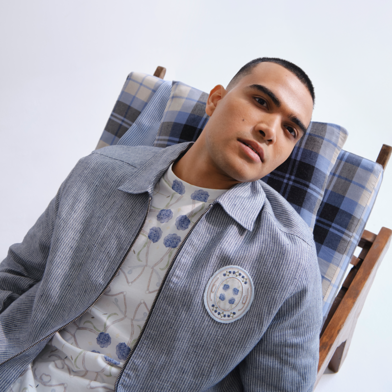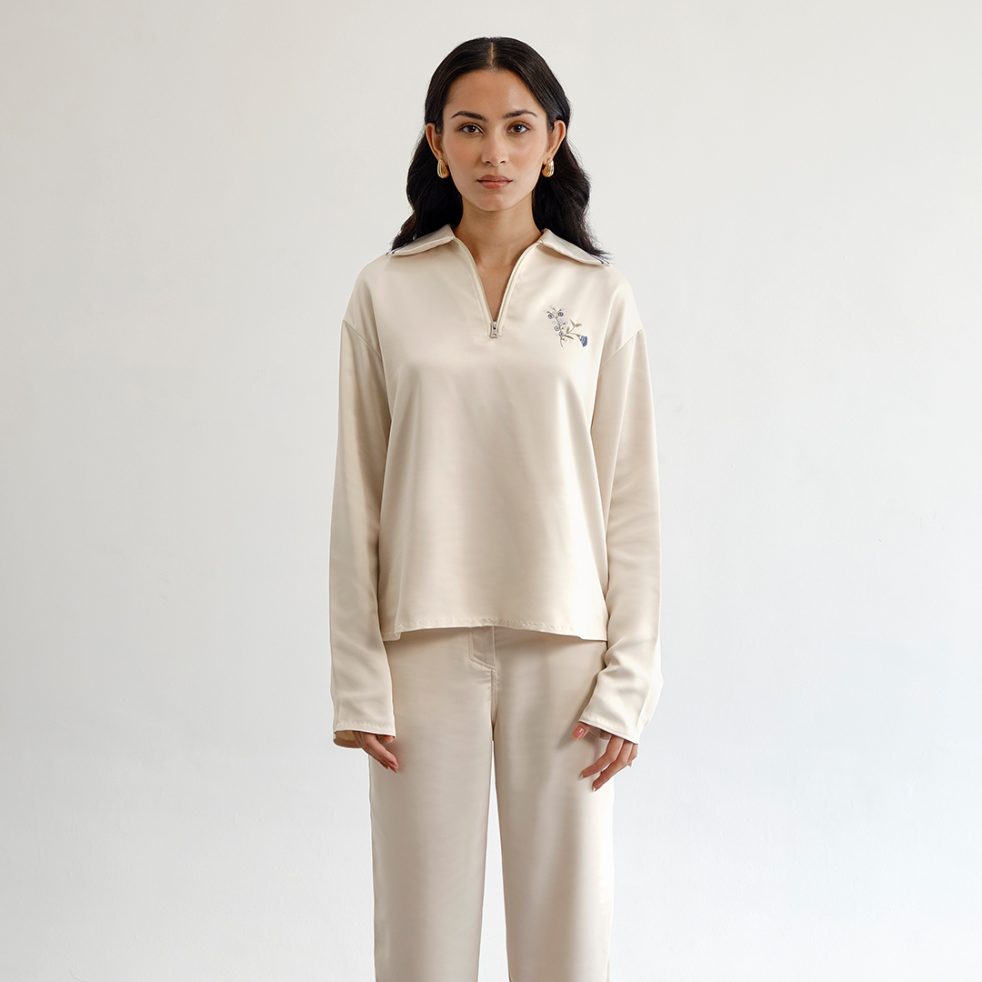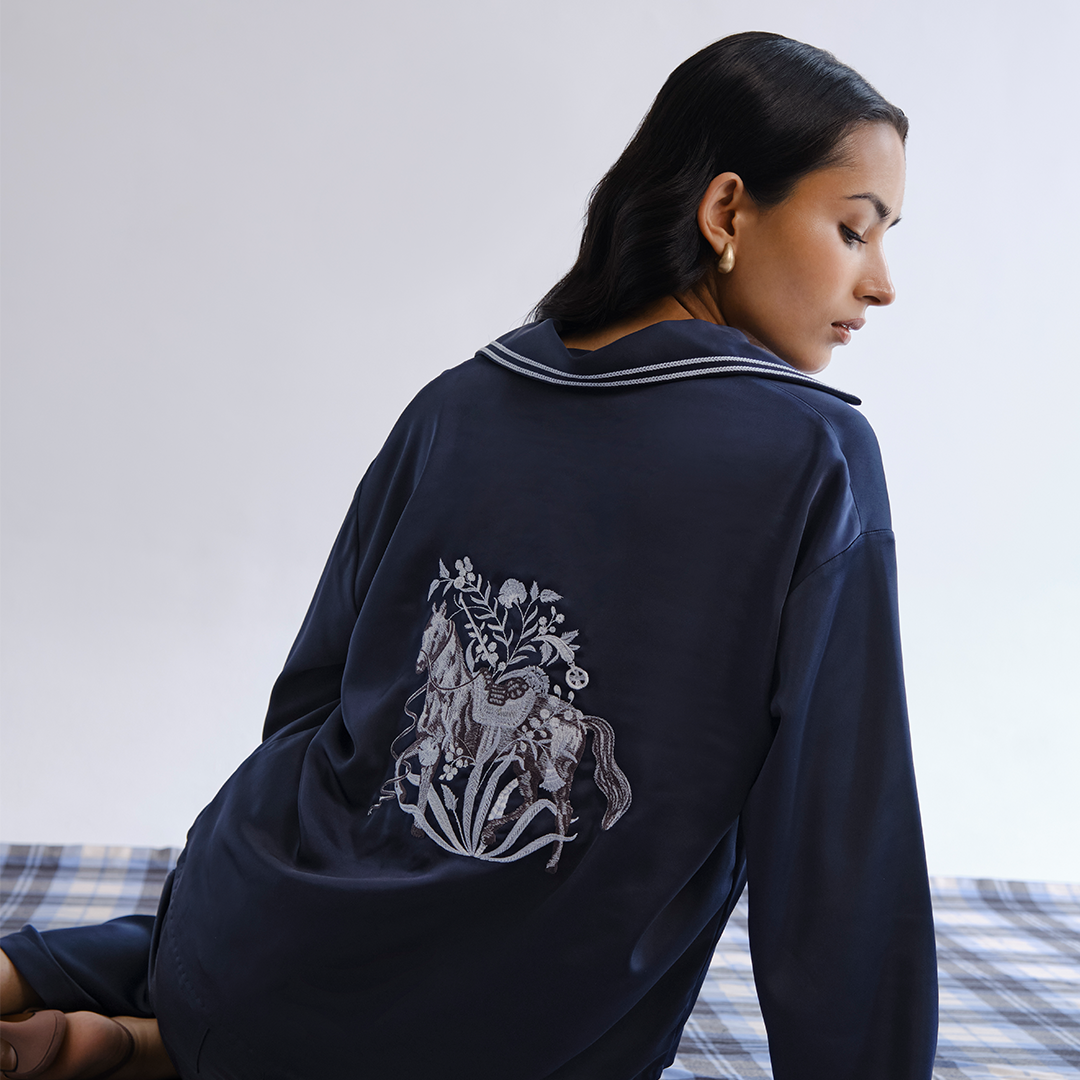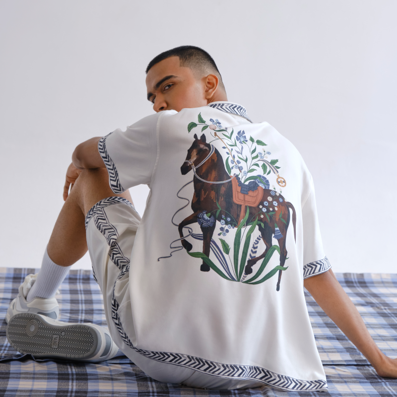 Crafted in a fluid satin twill with a relaxed fit, this shirt features an oversized collar with outline detail. The 'Botanical Polo' print at the front and back intertwines botanical motifs with elegant polo gear—a modern interpretation of craft and heritage detailing.